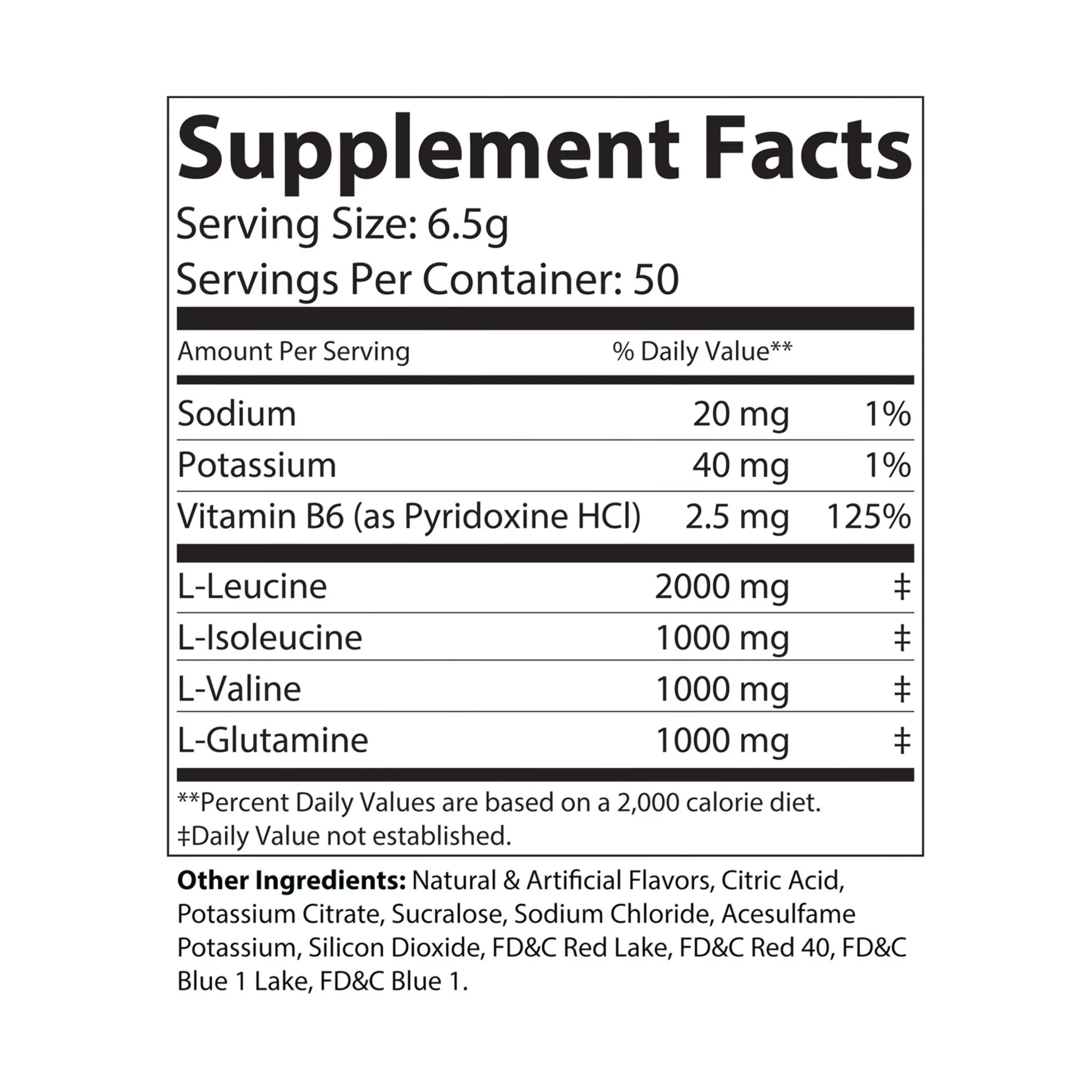 Ingredients: Sodium, Potassium, Vitamin B6 (as Pyridoxine HCl), L-Leucine, L-Isoleucine, L-Valine, L-Glutamine. Other Ingredients: Natural & Artificial Flavors, Citric Acid, Potassium Citrate, Sucralose, Sodium Chloride, Acesulfame Potassium, Silicon Dioxide, FD&C Red Lake, FD&C Red 40, FD&C Blue 1 Lake, FD&C Blue 1.